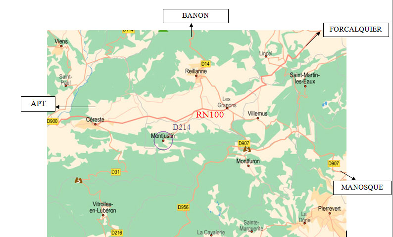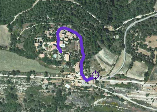 Etape 2 : une fois au rond point du petit village de Montjustin (matérialisé par le rond sur cette photo aérienne), prendre vers la droite, sur la petite route qui mène au centre du village : c'est la maison la plus au SUD, face à vous. | ||||
